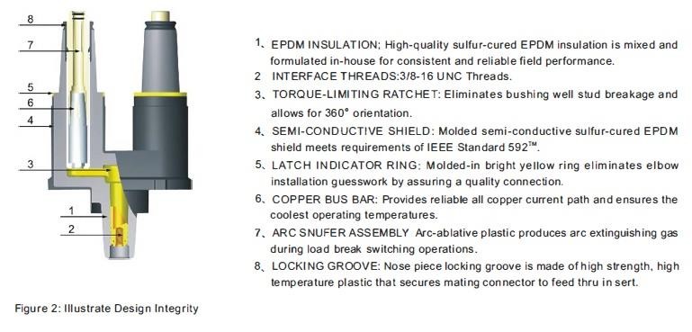 इंसर्ट 200A लोडब्रेक एल्बो कनेक्टर, एल्बो सर्ज अरेस्टर और समान वोल्टेज रेटिंग के उपकरण बुशिंग कुओं के साथ काम करता है।