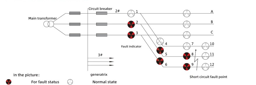 शॉर्ट-सर्किट दोषों की विशेषताओं के आधार पर, कार्रवाई मानदंड सुरक्षा उपकरण की बिजली विफलता के साथ वर्तमान में अचानक परिवर्तन है। दोष संकेत आरेख का व्याख्या तर्क इस प्रकार है: यदि चरण ए के संकेतक 2, 5, और 8 और लाइन 2 के चरण सी के संकेतक 3, 6, और 9 सभी लाल हो जाते हैं, जबकि संकेतक 11 और 12 सफेद रहते हैं, तो यह निर्धारित किया जा सकता है कि उस आउटगोइंग लाइन बिंदु पर शॉर्ट-सर्किट गलती हुई है।