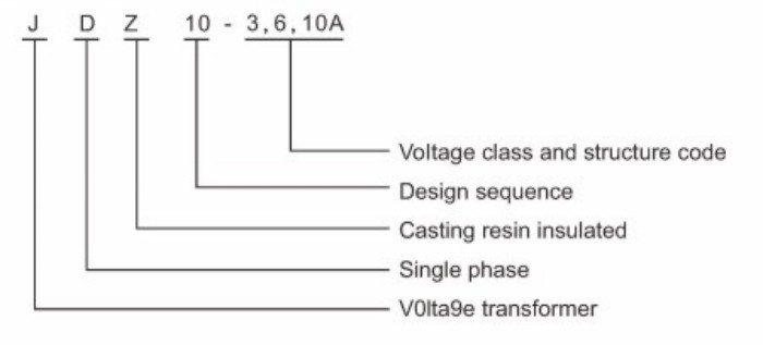 जे = वोल्टेज ट्रांसफार्मर, डी = एकल चरण, जेड = एपॉक्सी राल कास्ट इन्सुलेशन, 3/6/10 = वोल्टेज स्तर।